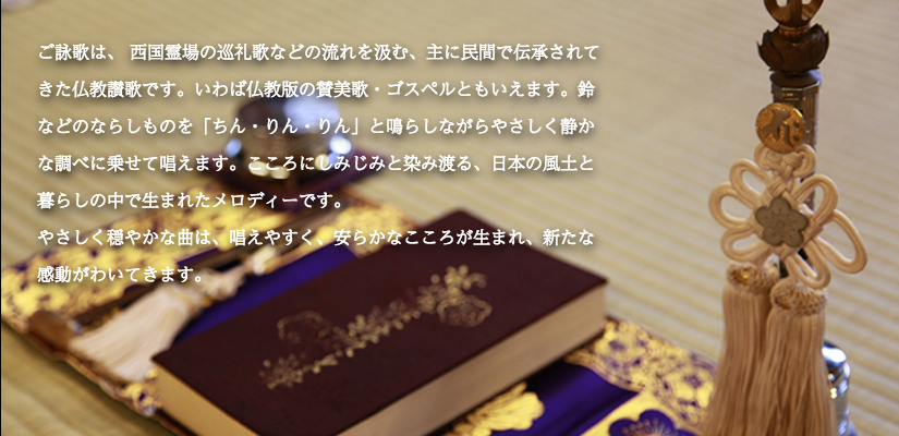 讃歌えいさんか とは、声明しょうみょう などの流れも汲む、主に民間で伝承されてきた仏教讃歌です。いわば仏教版の賛美歌・ゴスペルともいえます。
