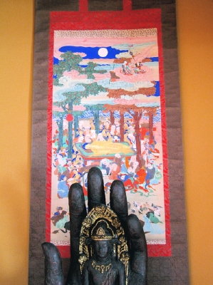 沙羅双樹の間に横たわり死を迎えるお釈迦様と、まわりに悲しむ弟子たちとお釈迦様を慕う動物たちも集まります。天からはお釈迦様の母上であるマーヤ夫人。お迎えに来たのではなく、お薬を届けに来たのだそうです。しかし、天から投げた薬は沙羅の木にひっかかりお釈迦様のもとまでは届きません。これが生者必滅を示唆しています。この枕元に集った弟子たちに向けて最後にした説法をまとめたお経が『仏遺教経(ぶつゆいきょうぎょう)』(正式には『仏垂般涅槃略説教誡経』という)です。曹洞宗では正伝の仏典として尊重されています。