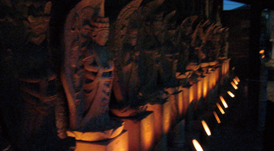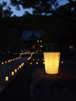 満月の夜のもと、竹ろうそくで境内をライトアップ